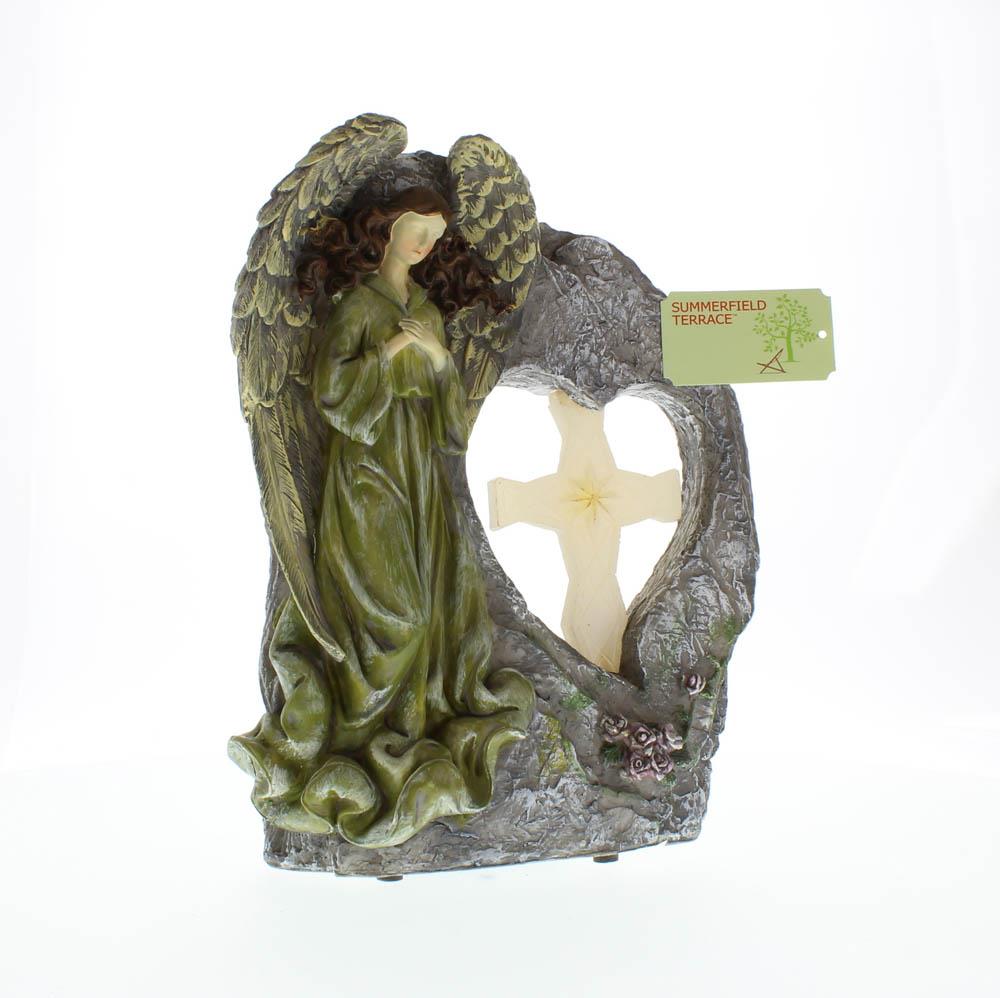 • An angel stands guard beside a holy cross, inspiring reflections of heartfelt faith. Stone-look statue beautifies your outdoor space both day and night with a hidden solar light setting the cross gently aglow at evening time.