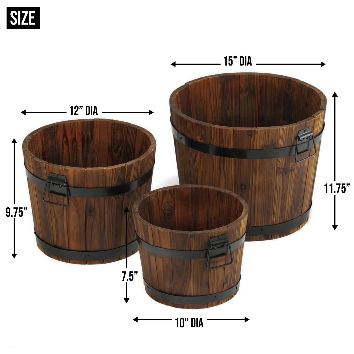 • This trio of planters have a look of aged oak barrels, complete with black metal banding and handles for ease of relocating around your yard as the mood or sun strikes. Each planter has a different size to allow you to make these the charming homes for a variety of plants.