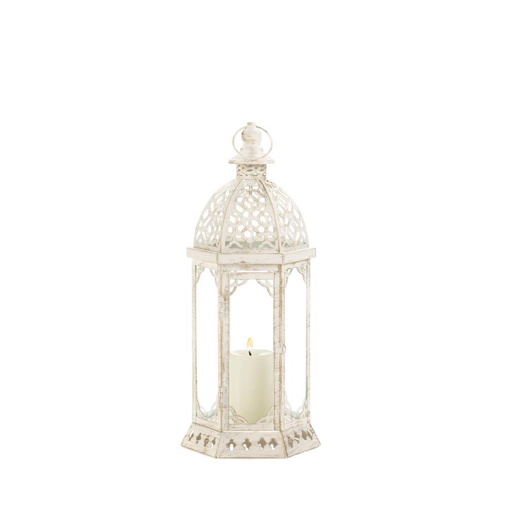 • Where graceful design and vintage patina meet, you'll discover this beautiful candle lantern. The frame is iron, finished in distressed vintage-style white, and the clear glass panels let the light from your favorite candle shine bright.