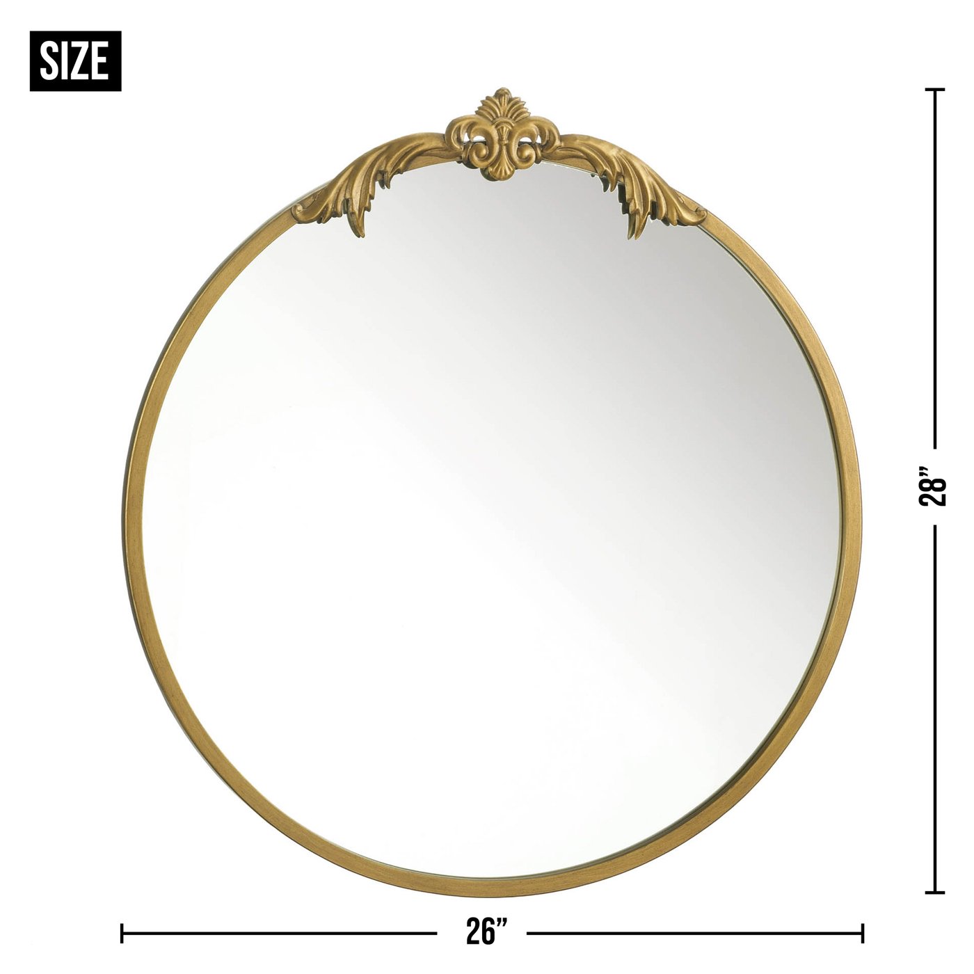 • Golden wall mirror weighs 10 lbs. and measures 26 inches by 28 inches by 1 inch.