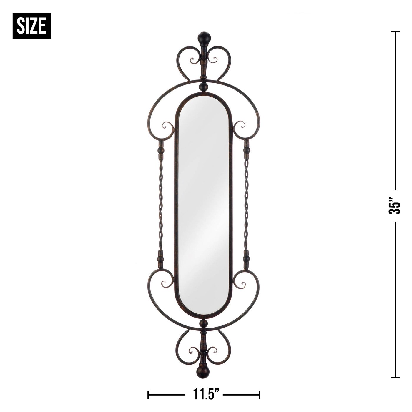 • Elegant wall mirror weighs 4.6 lbs. and measures 11.5 inches by 35 inches by 1 inches.