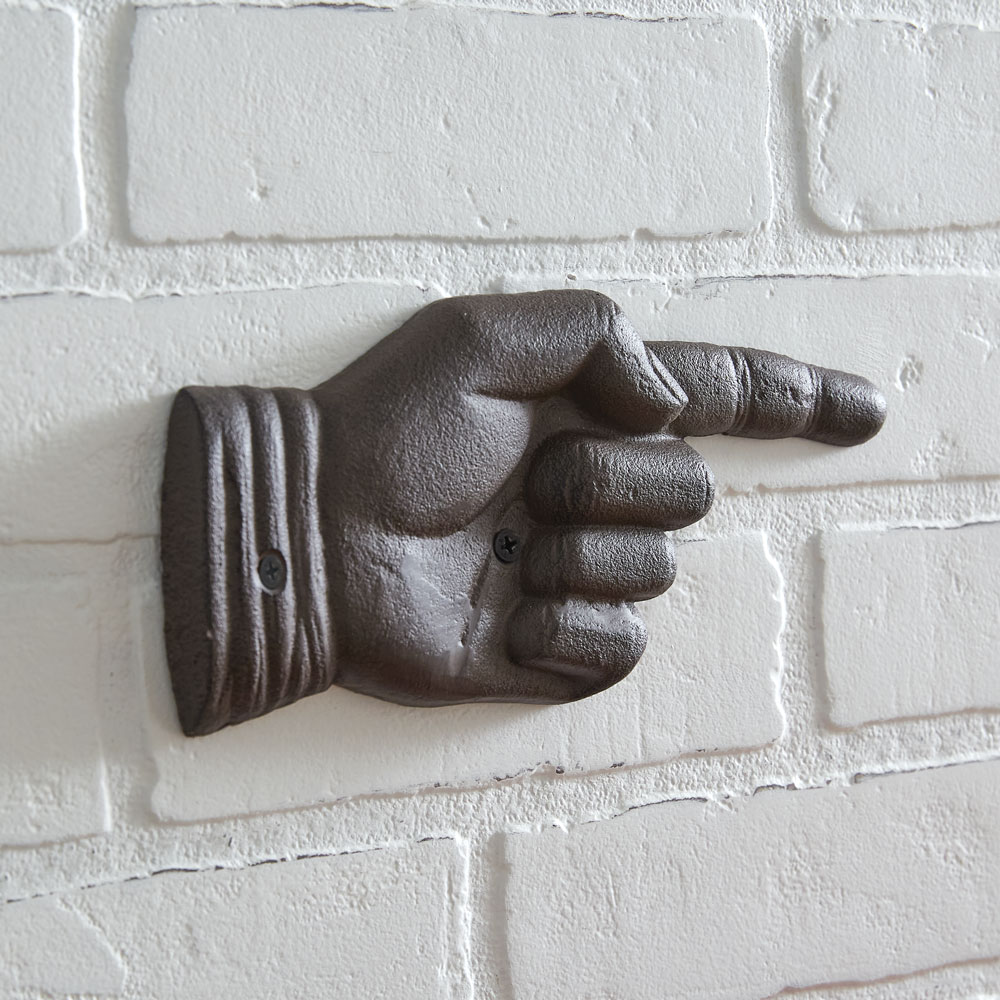 This way! Our antique-inspired Pointing Hand Plaque will show you the way or accentuate something special. This item is crafted from cast iron. To hang, use its two screw-hole hangers.