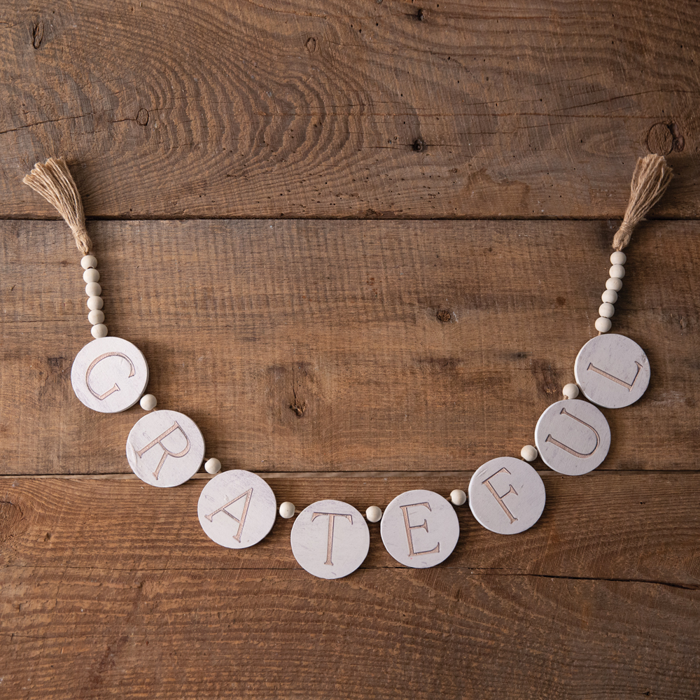 Be grateful! Use these beads to add texture and charm to a two-tier tray, wall, or any way you can imagine. Each strand has wood beads intertwined with a spring message and jute tassels on the ends.