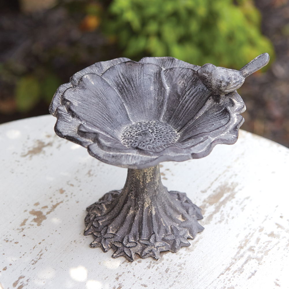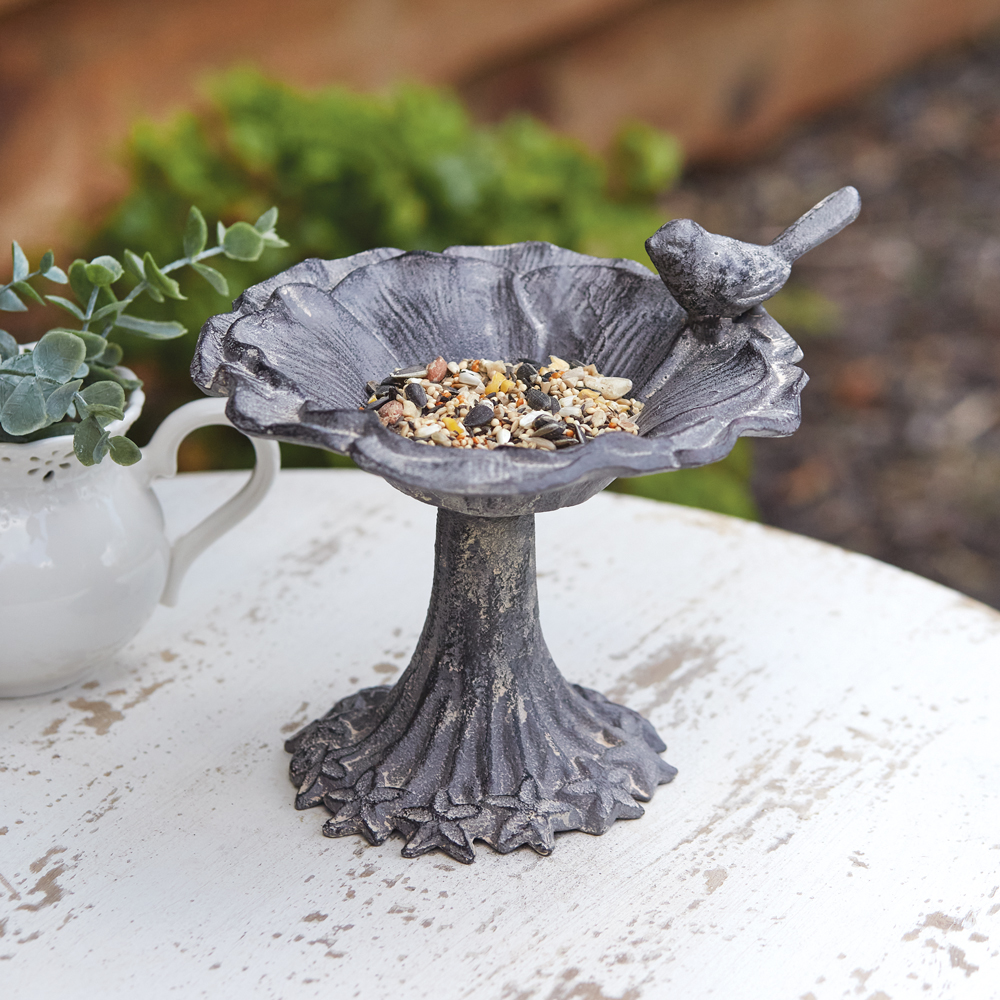 Treat your feathery friends with birdseed inside this tabletop feeder. Fashioned from cast iron, this item will withstand all the outdoor elements. Item can be used indoors with candles or other small items as well.